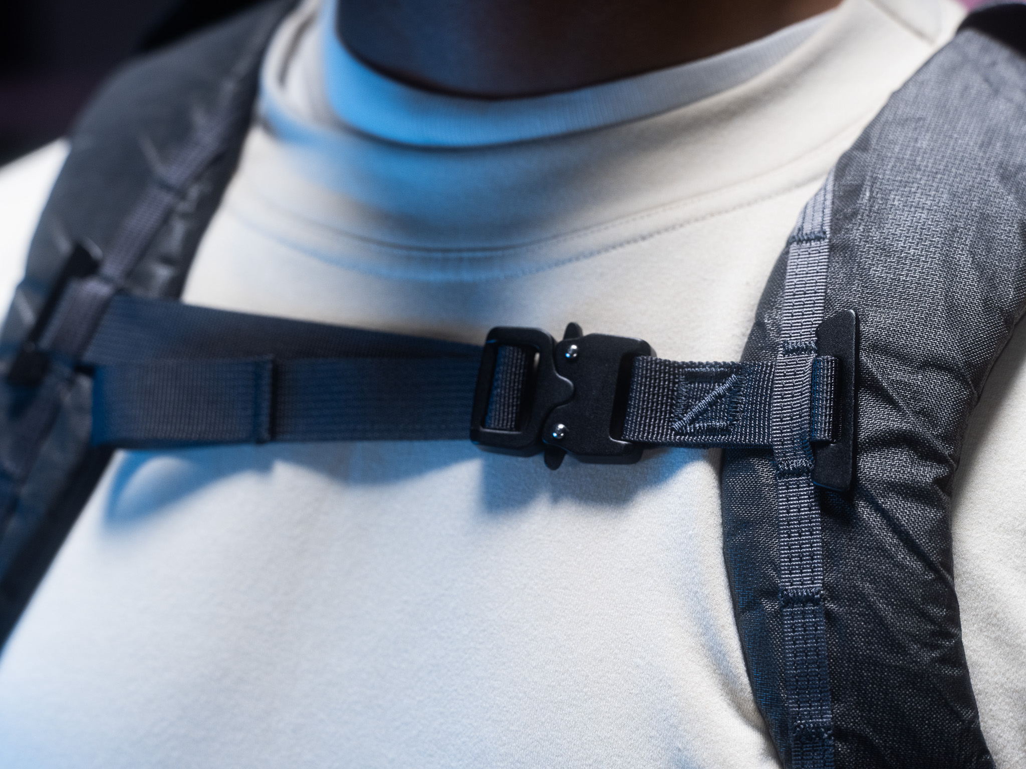 堅固五金:全鋁製胸扣、拉環與梯扣,與包身顏色陽極氧化處理。