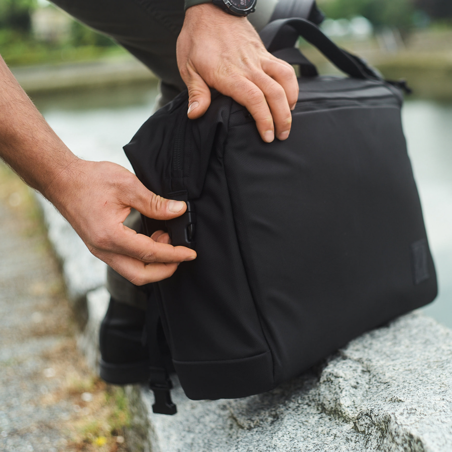 兩層泡棉之間有側口袋,可從外部進入。一側有不同尺寸的插入式口袋,可放置 EDC 和鑰匙圈。一種尺寸可用作文件口袋,或可透過TB20底部的秘密拉鍊展開為行李傳遞套。